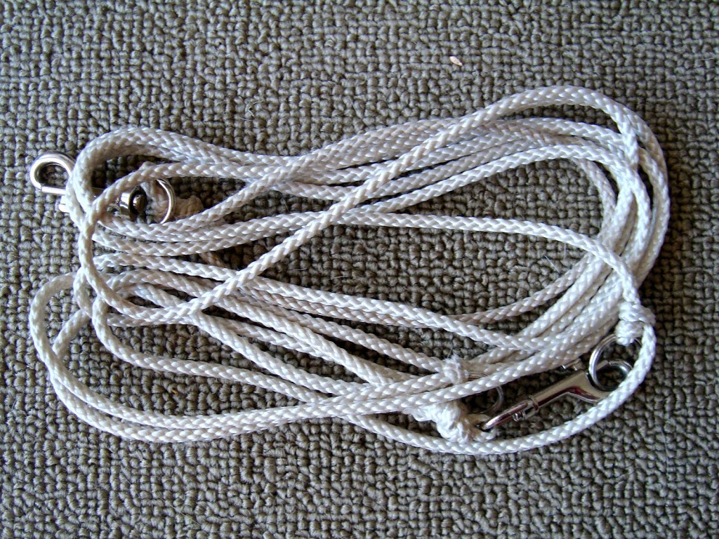 Nous obtenons ainsi une très longe laisse, apparentée à une longe, permettant de faire des promenades dans une semi-liberté tout en gardant contrôle de son chiot. Elle est également utile pour entrainer le rappel (si le chiot ne répond pas au rappel, on l’attirera à nous grâce à la corde pour qu’il l’apprenne, sans oublier la friandise au bout !).