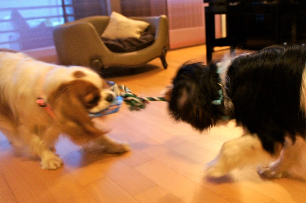 Une balle en noeud d’un côté, une poignée de l’autre. La dental corde de Trixie n’est pas restée longtemps sur la table. Milo n’arrêtait pas de la voler, et les deux chiens se sont tiraillés la corde dans tout l’appartement. Un grand succès pour cette corde !